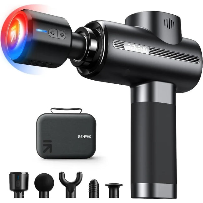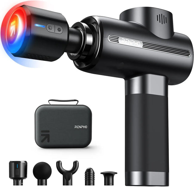 Hot and Cold Therapy: Renpho Massager gun deep tissue with Heat comes with a heating and cooling massage head(No built-in battery) that can heat up to 113 °F (45 °C) or cool down to 47 °F(8 °C) for deeper muscle relaxation and stress relief