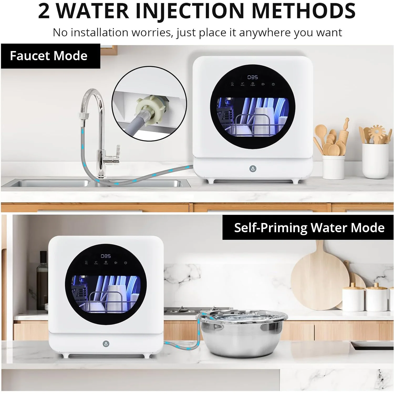 Dual water inlet mode: This portable tabletop dishwasher provides two water inlet options: direct connection to the faucet and self-priming mode, which is suitable for situations where the faucet is inconvenient and can directly draw water from the bucket. This flexibility makes it suitable for a variety of environments and meets different household needs.