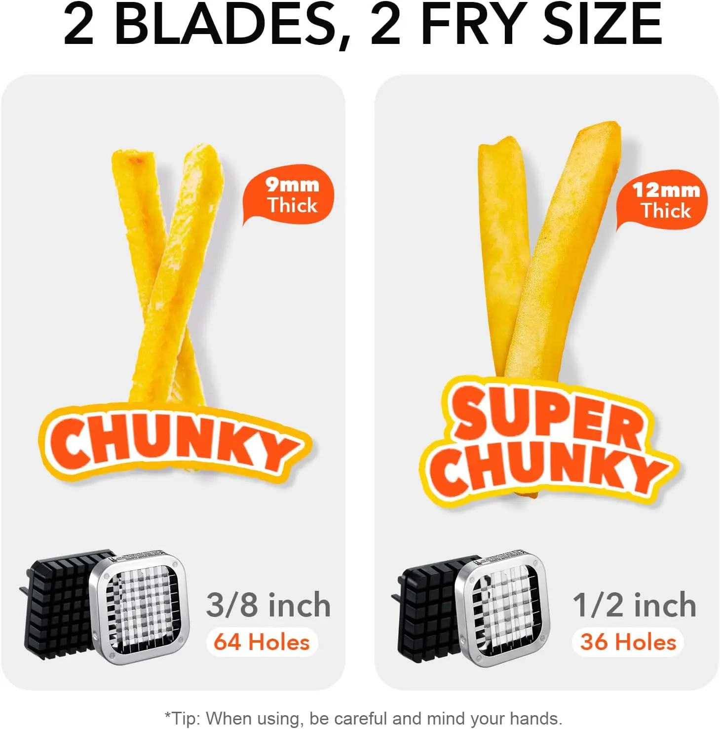 - 2 Sizes Blades: Make 1/2" thick, 3/8" thin evenly cut french fries in your home! Changing blades in seconds by just loosening two screws