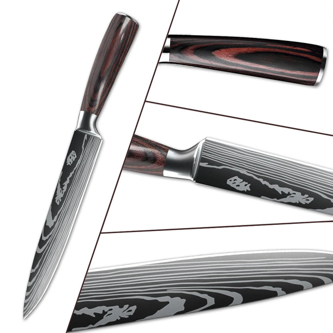 The blade is made of stainless steel 7CR17, the surface of the Damascus laser pattern, very beautiful, good finish, sharp like a razor, keep your kitchen away from the blunt knife and enjoy your kitchen life!