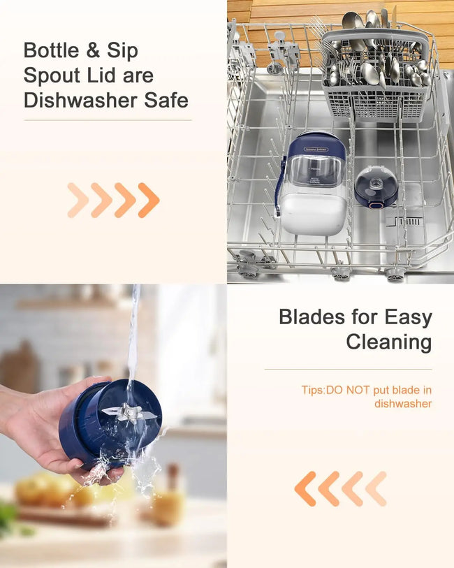 5. Safe for Use, Easy to Clean and Easy to Charge: the electric blender only works when the mixing cup is properly Tighten; USB Type C Rechargeable blender; side handle of bottle keep the food blender balanced while working; Cups and Flip and Sip Lid are dishwasher-safe; lifetime technical support